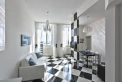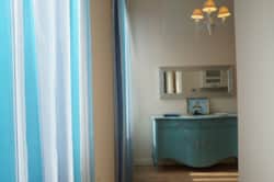 Con il suo parquet chiaro, ha un gusto un po’ Shabby Chic dove i colori predominanti sono il bianco e l’azzurro. L’appartamento si caratterizza per la sua luminosità e per il suo brio.